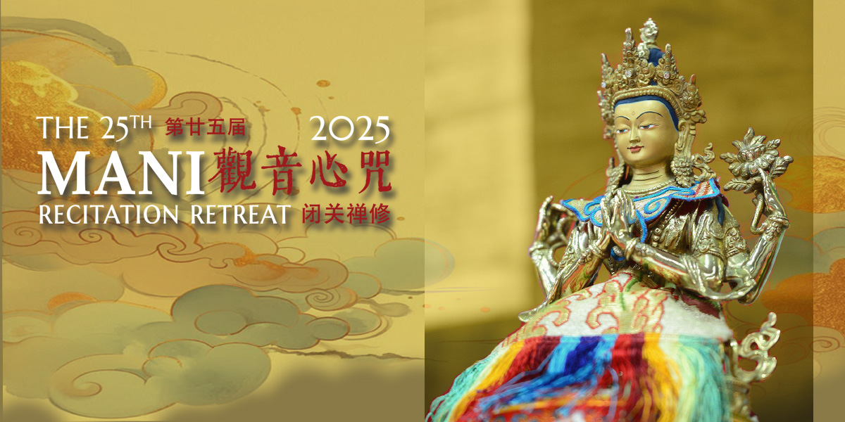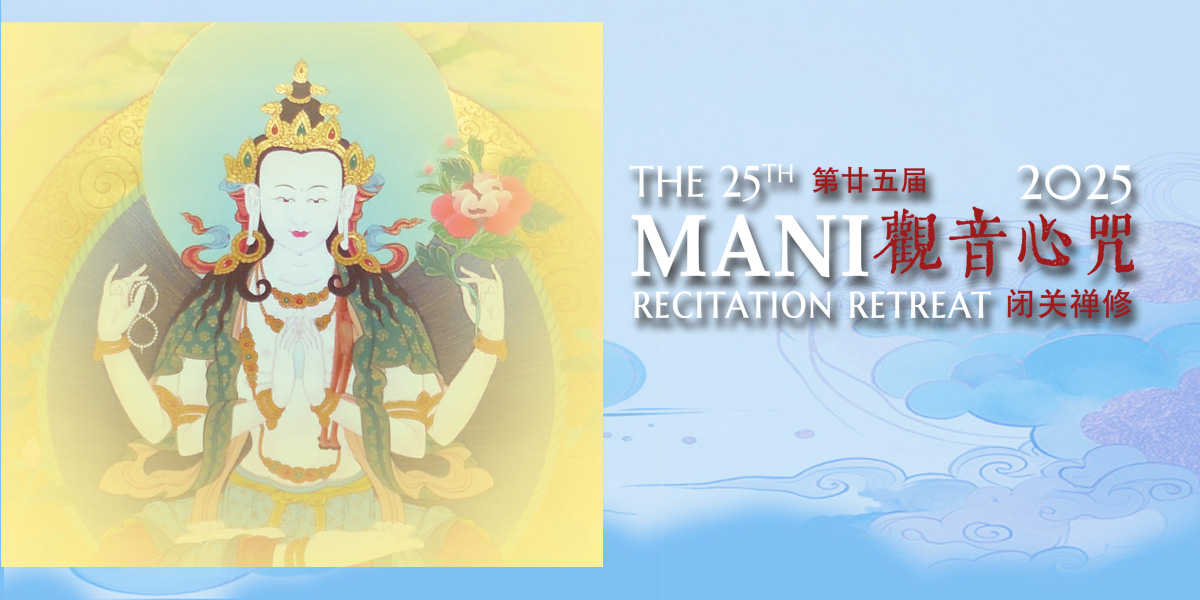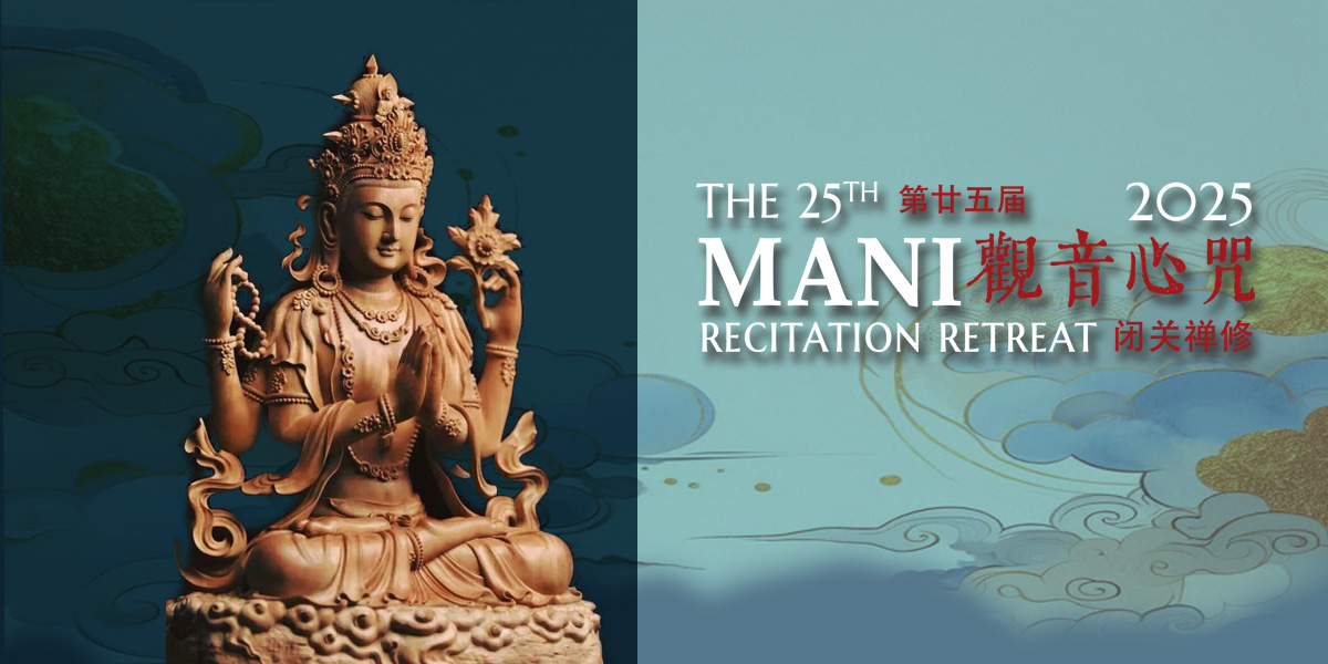 Mani Retreat is a recitation retreat where participants gather to recite the six syllabus mantra OM MANI PADME HUNG, which is the heart mantra of Avalokiteshvara (Guan Yin) Bodhisattva.